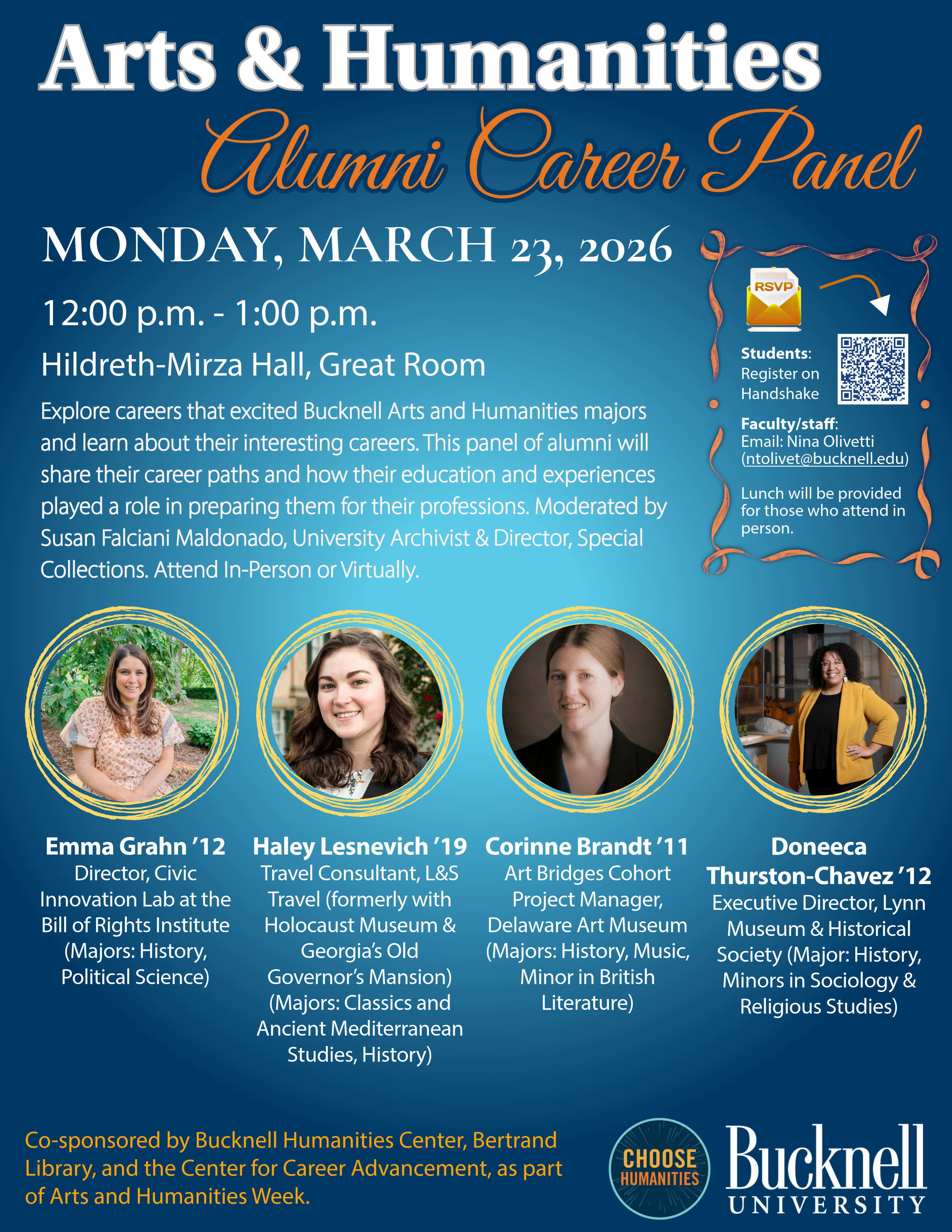 Co-sponsored by Bucknell Humanities Center, Bertrand Library, and the Center for Career Advancement, as part of Arts and Humanities Week.